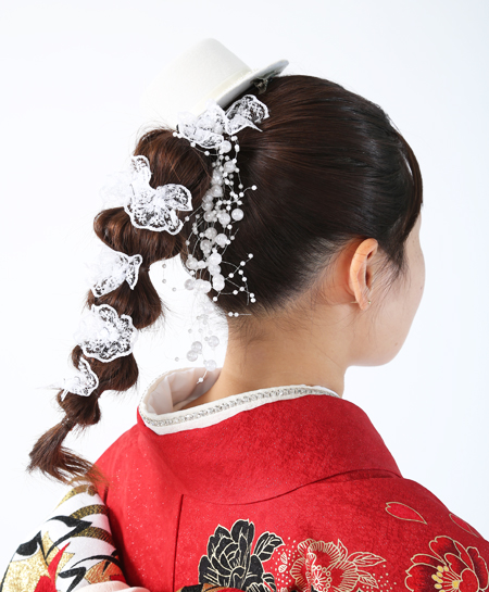 振袖が派手めの洋柄なので、髪飾りも洋風に仕上げています。