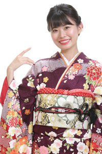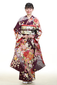 紫色に様々な色と柄の入った振袖です