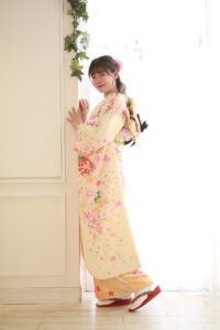 淡いオレンジ色にたくさんの小花が華やかな振袖です