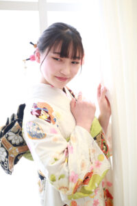 白色の振袖といっても紫色が入っていたり、黄緑色が入っていたりで