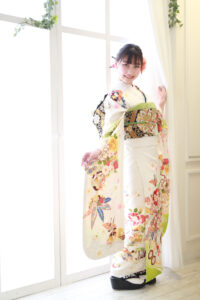 こちらの振袖、小物も黄緑色でまとめることで