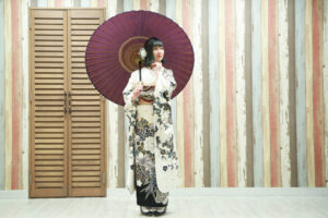 白地に黒色のグラデーションが目を引くこちらの振袖